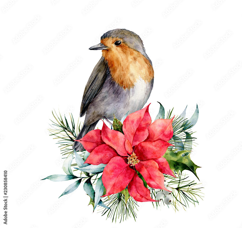 Watercolor Christmas Card With Robin And Winter Design Hand Painted Bird With Poinsettia Mistletoe Fir Branch And Holly Isolated On White Background Holiday Symbol For Design Print Stock Illustration Adobe Stock