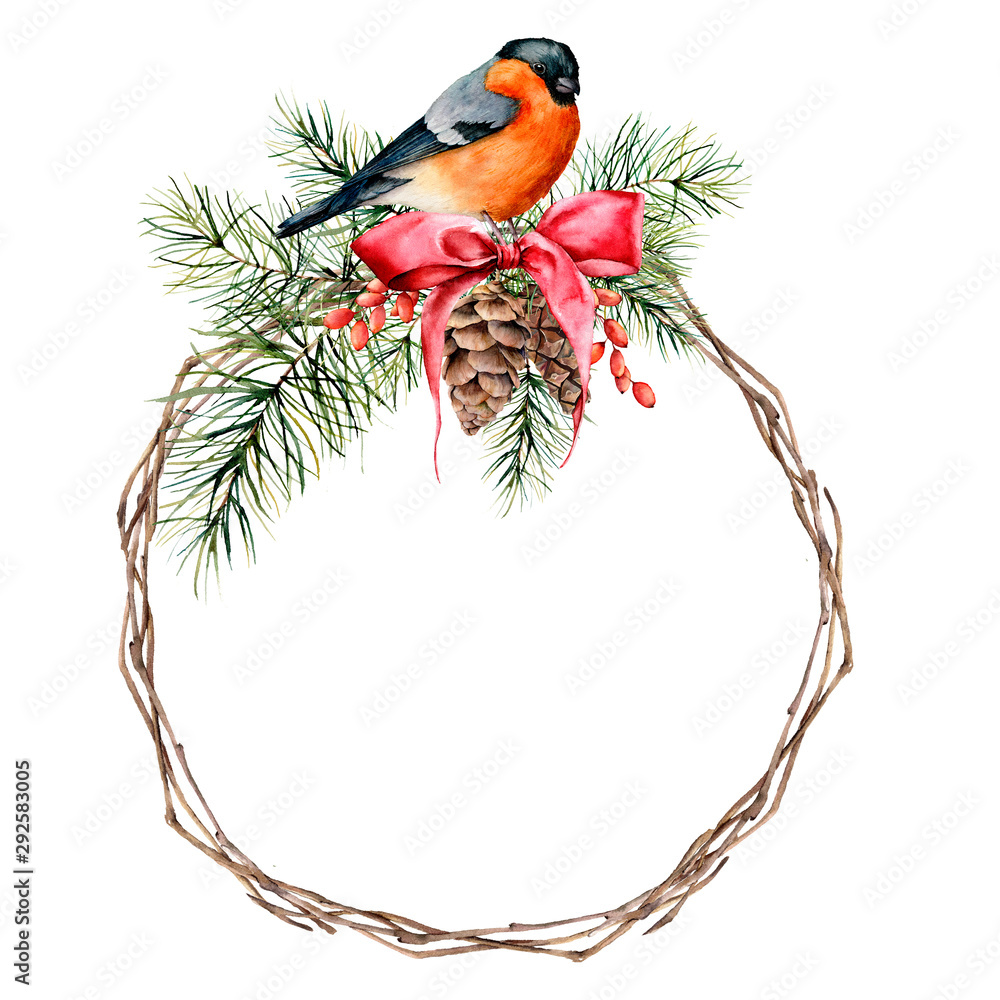 Watercolor Christmas Wreath With Bullfinch And Winter Design Hand Painted Bird With Pine Cone Red Bow Berries Fir Branch Isolated On White Background Holiday Symbol For Design Print Background Stock Illustration